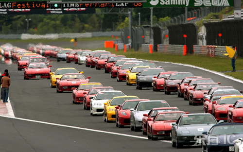 當地時間2008年5月11日,日本靜岡縣小山町富士賽道,490輛法拉利排起長龍準備創造新的“最大規模法拉利汽車遊行”的吉尼斯世界紀錄。目前的世界紀錄是2007年6月在英國創造的,當時有385輛法拉利汽車參加這一活動。